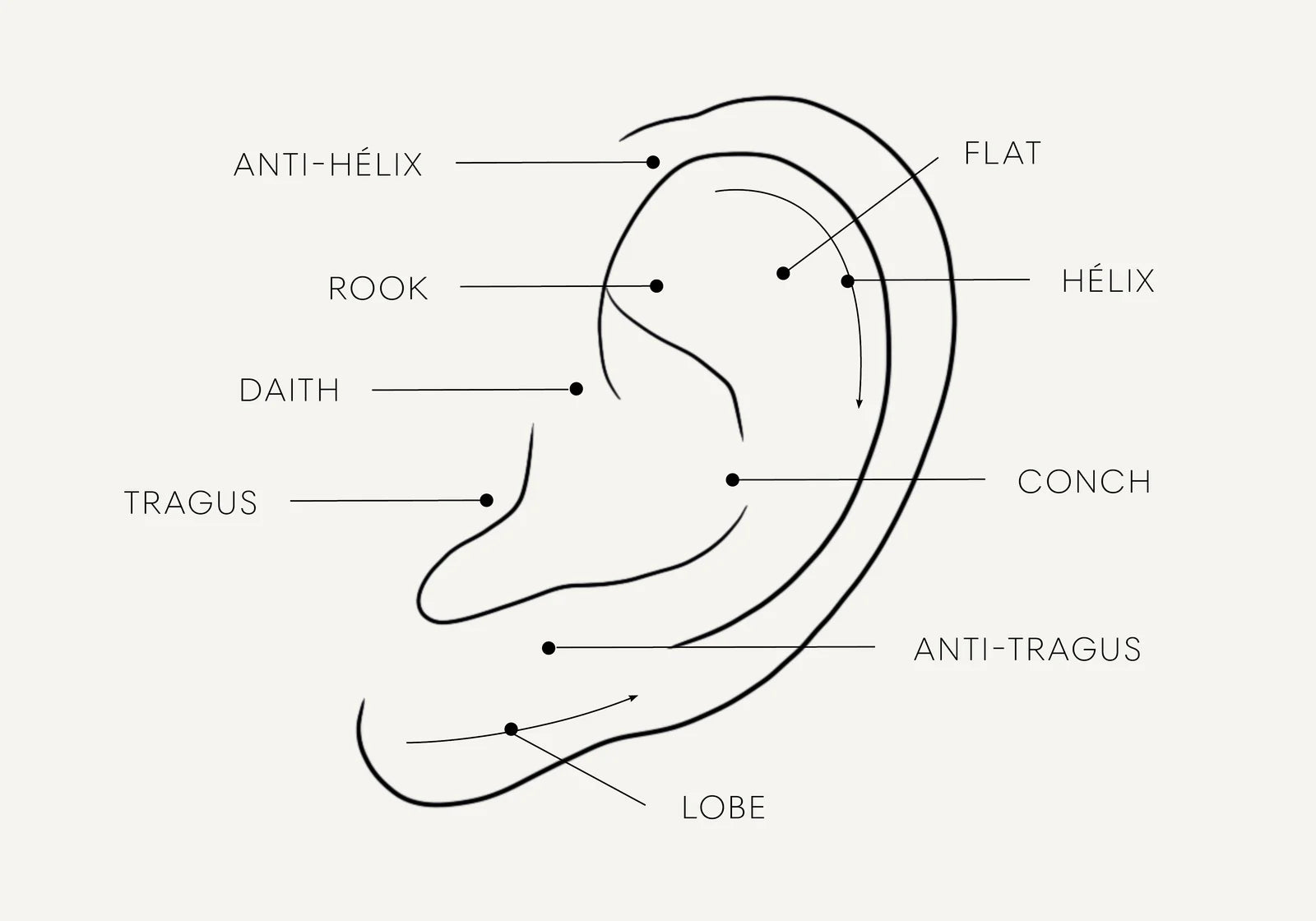 L'anti-tragus est situé juste en face du tragus, à l’endroit où le cartilage rencontre le lobe supérieur.• Durée de cicatrisation : 9 à 12 mois