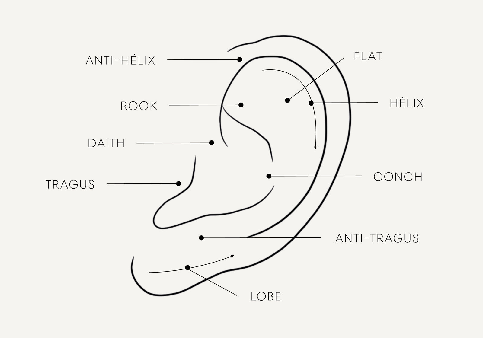 Located on the upper edge of the ear in a cartilaginous area, the helix is very popular. It is the ideal place to wear rings or piercings that follow the curve of your ear.• Healing time: 6 to 12 months