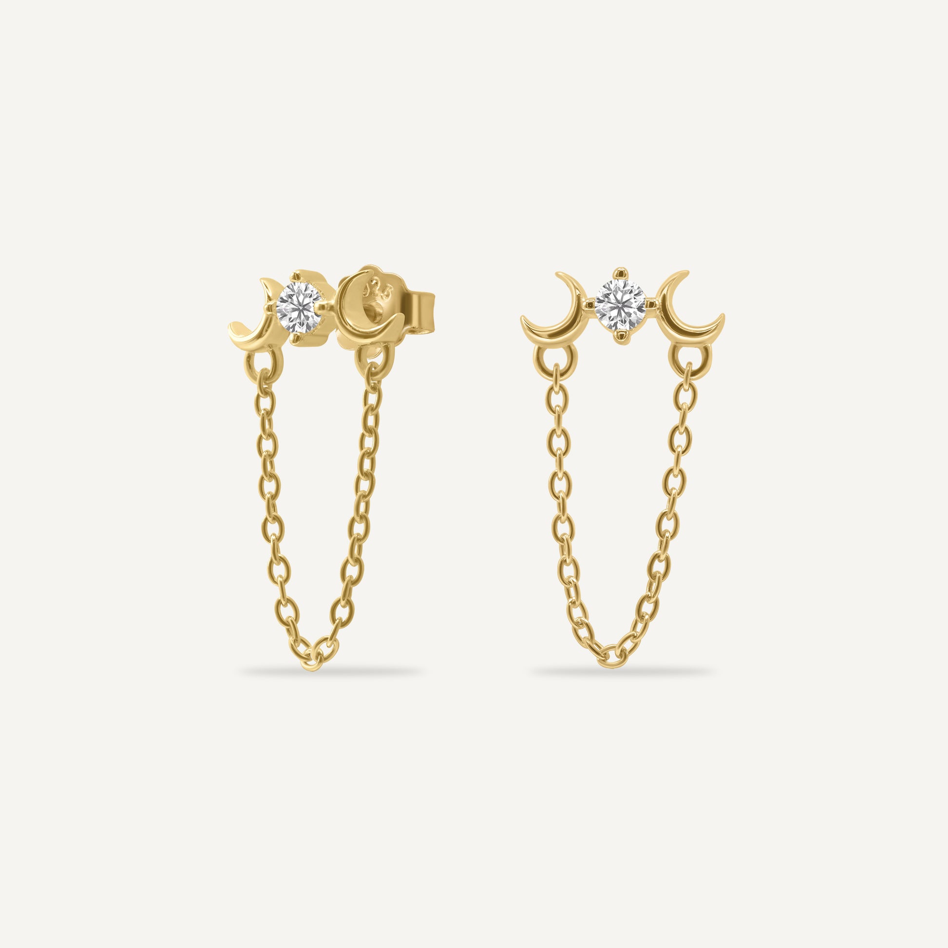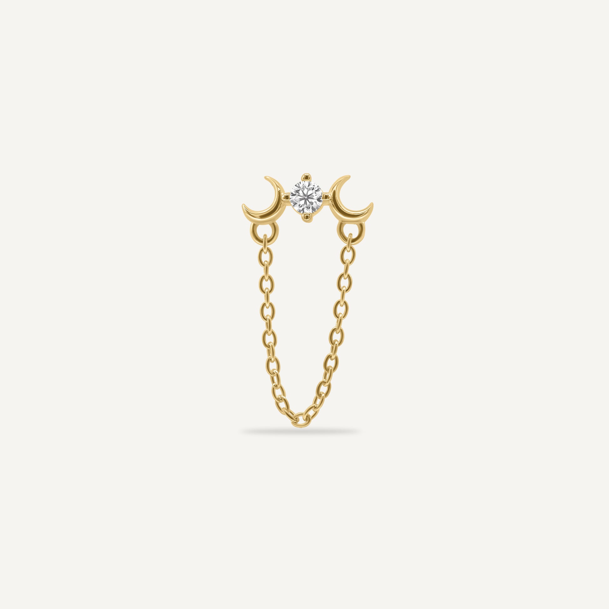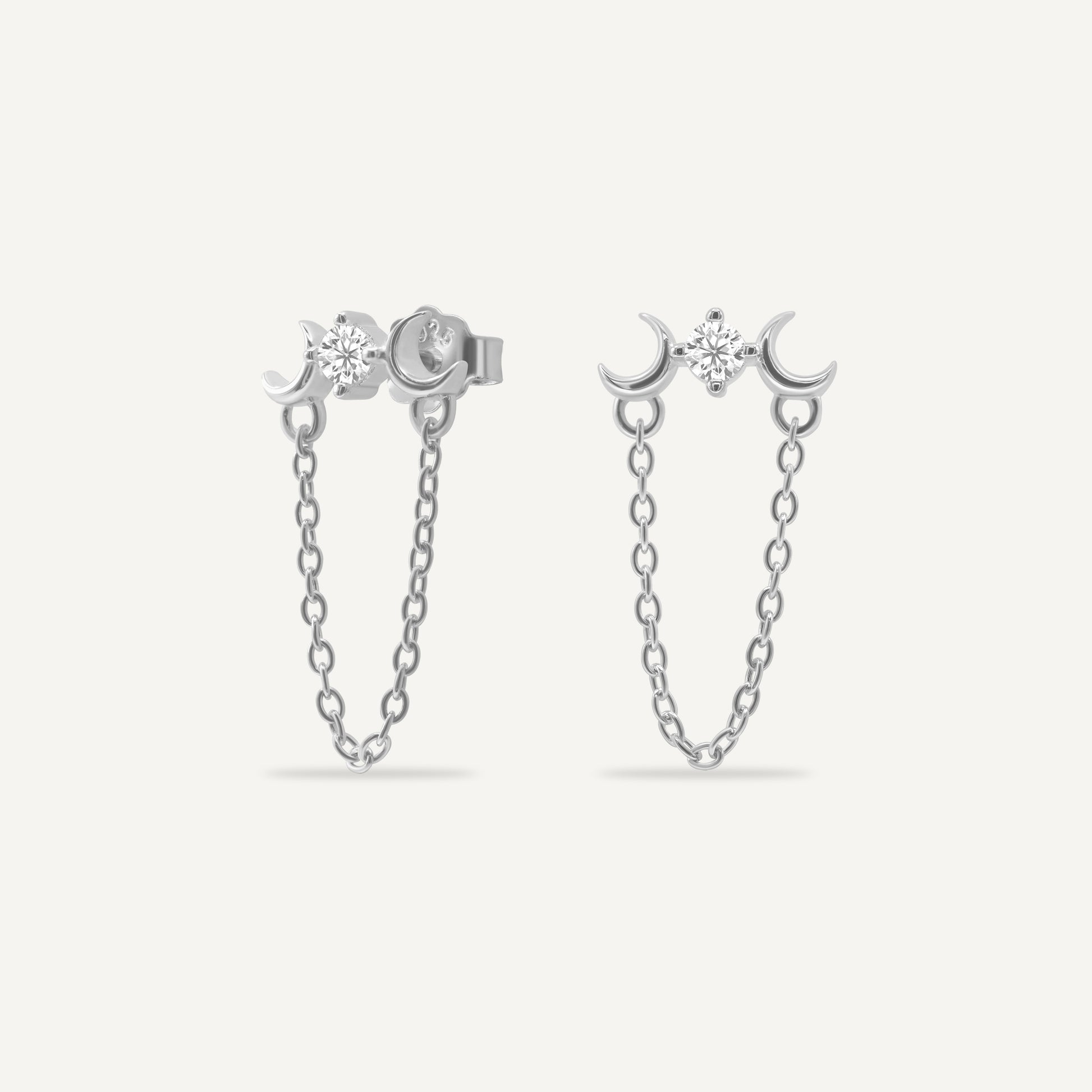 Dive into celestial balance with the Nocturne ear stud . Two mirrored moons are connected by a delicate chain. A round zircon in the center highlights this harmony, recalling the balance between the clarity and the soft darkness of the night.