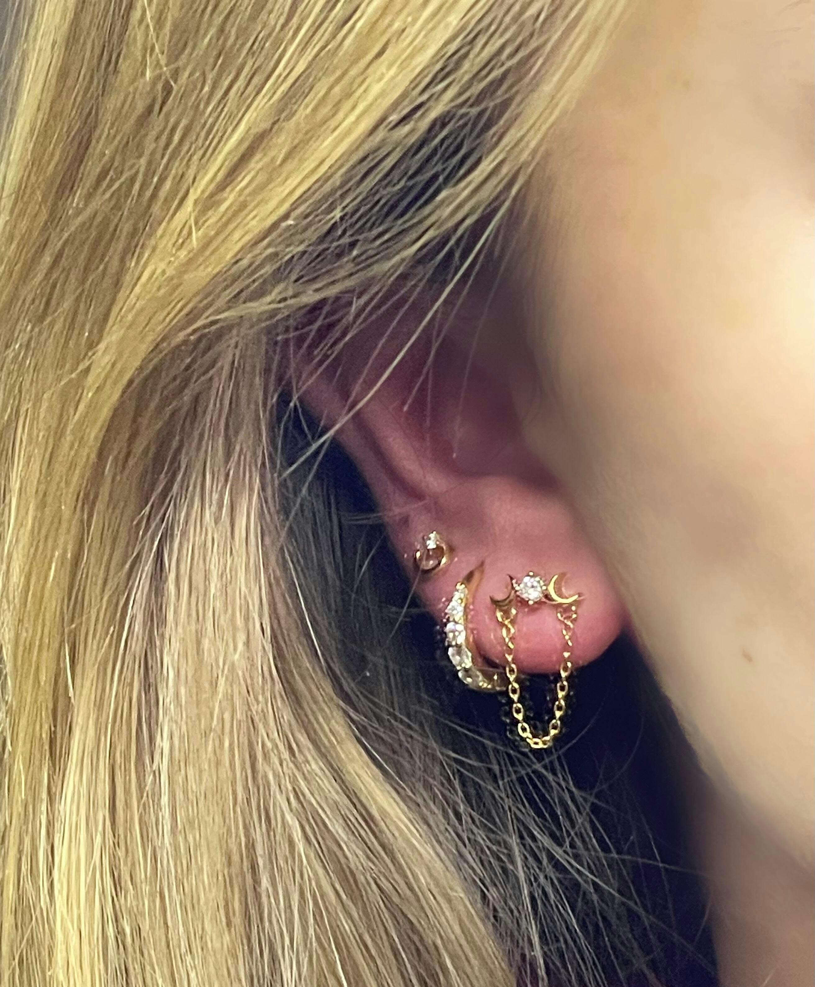 Plongez dans l'équilibre céleste avec la puce d'oreille Nocturne. Deux lunes en miroir reliées par une délicate chaîne. Un zircon rond au centre souligne cette harmonie, rappelant l'équilibre entre la clarté et la douce obscurité de la nuit.